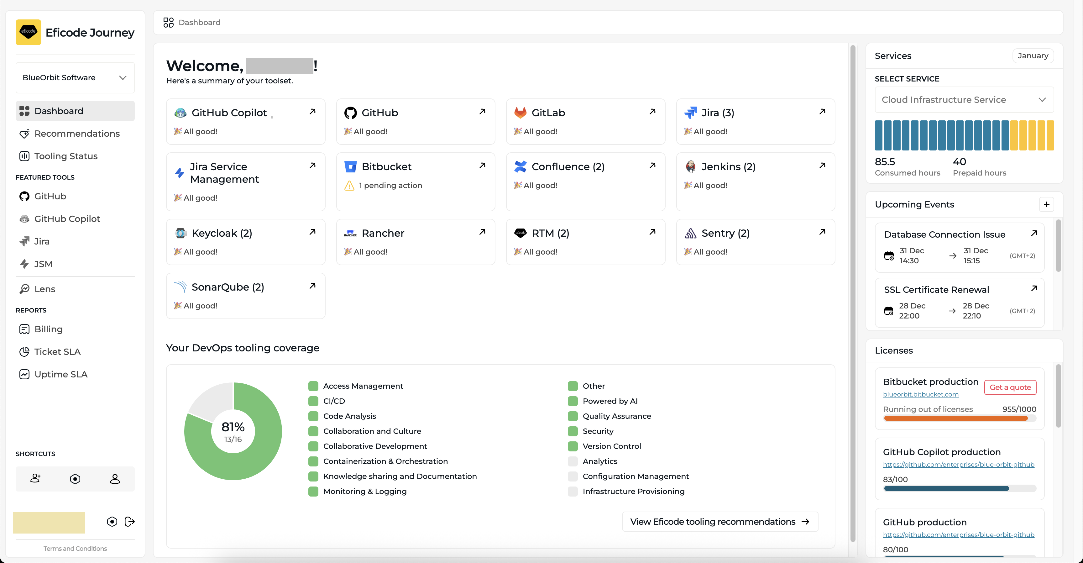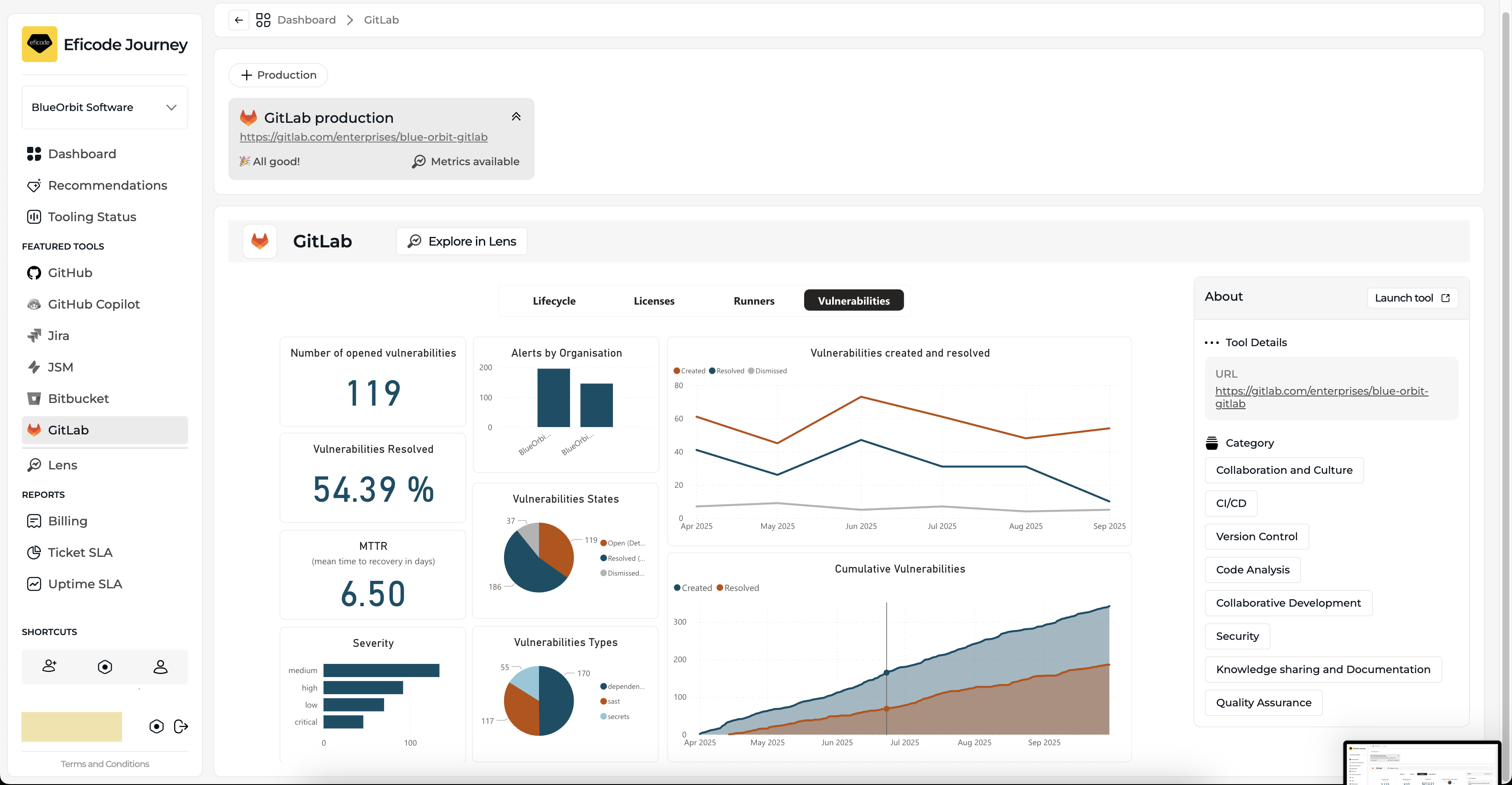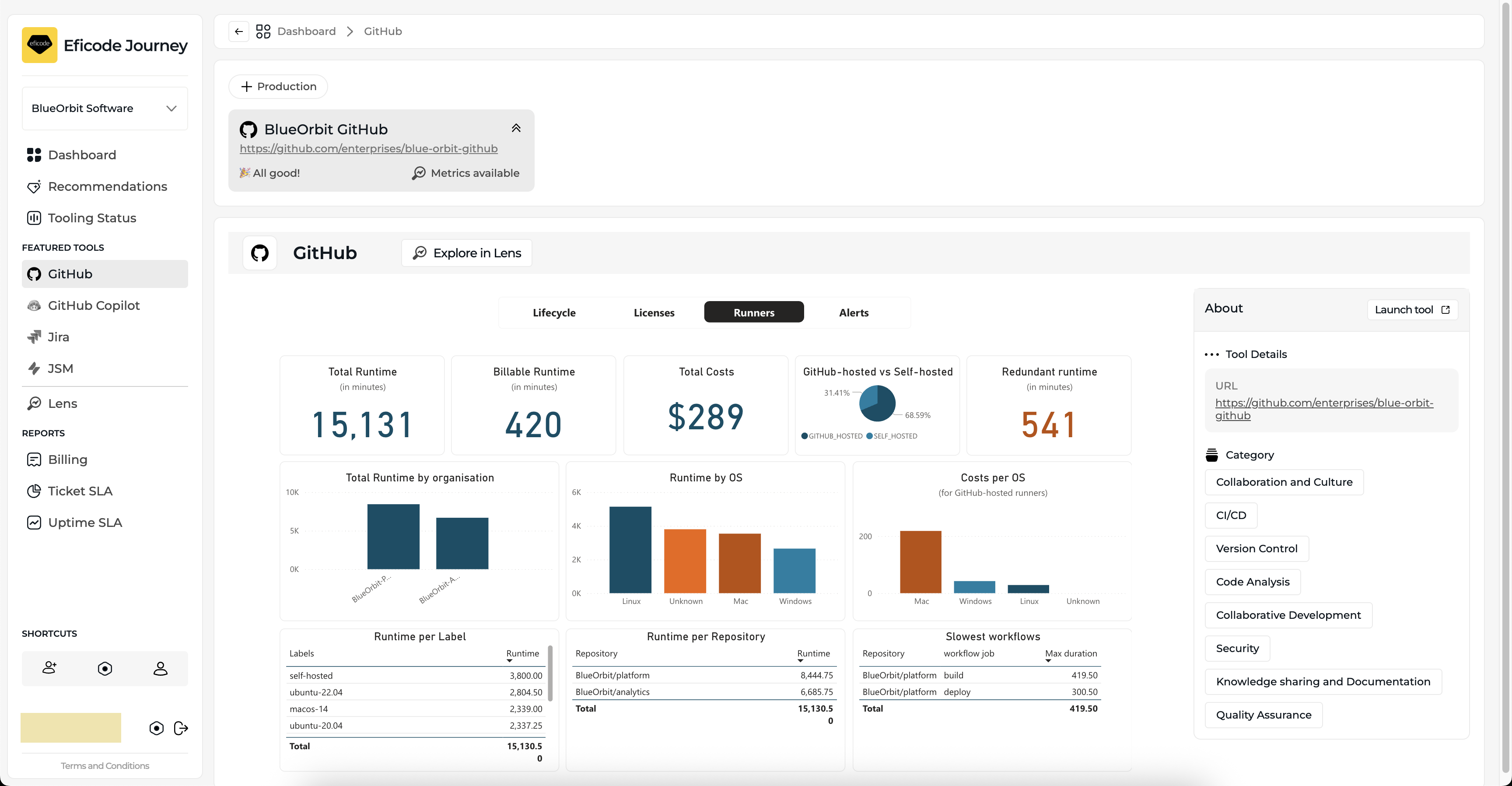 - What we shipped: (Requires Eficode Connector) Advanced Metrics enable us to see, at a glance, the current state of an organization’s tool adoption and usage. Using their expertise, Eficode experts can spot discrepancies and work with the customer to address those.