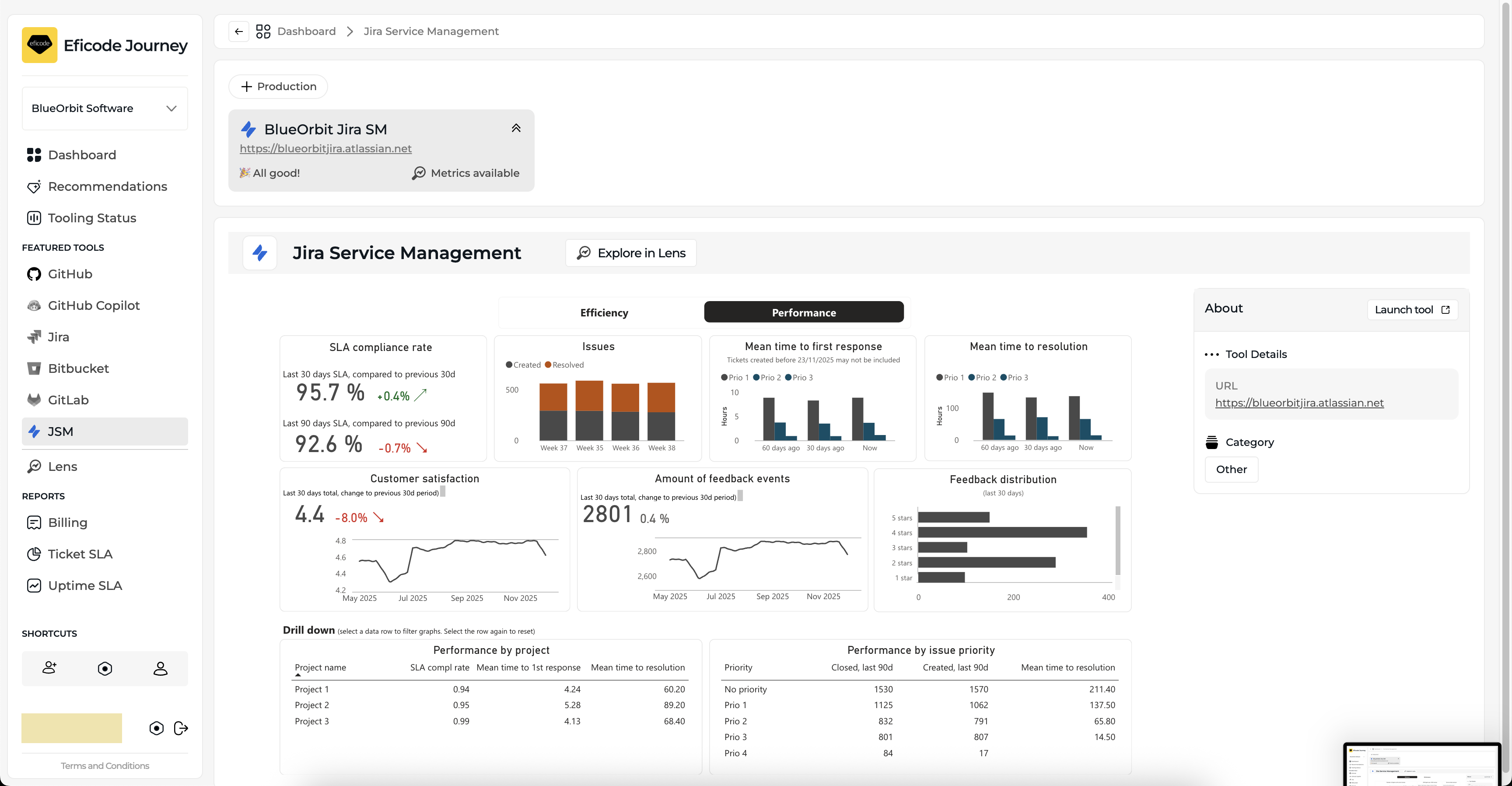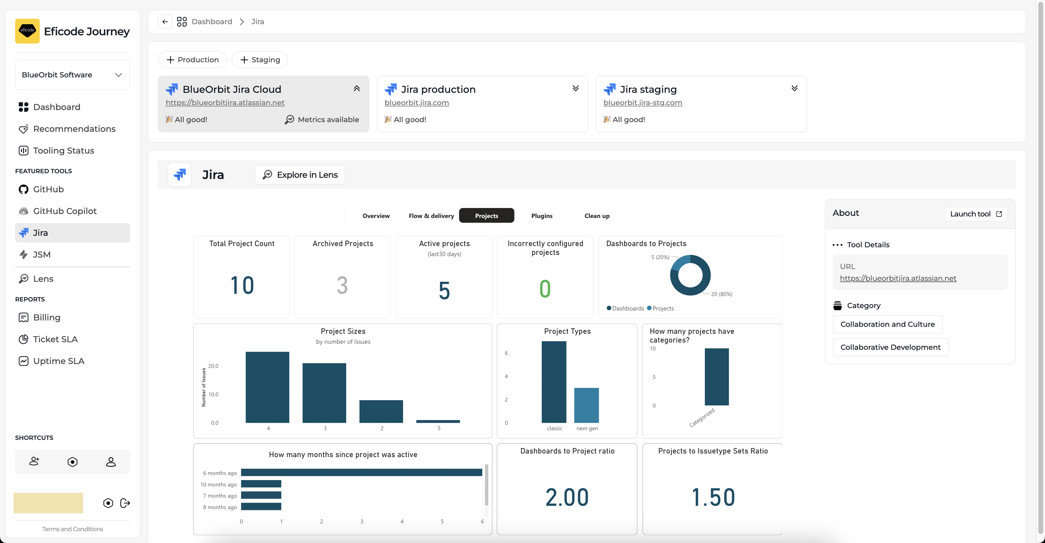 Customers get a secure, vendor-native way to unlock cross-tool analytics without exposing intellectual property or personal data. Through Eficode Journey, they gain visibility into how their toolchain is used, where bottlenecks and risks are building up, and how initiatives (AI adoption, migrations, or process changes) impact outcomes over time. Customers reap most of the benefits when sitting with an Eficode advisor, who helps translate signals into concrete actions. The connectors are built to be complementary to each other, each covering at least one aspect of modern tool stacks: project management, software development pipelines, cloud orchestration, and more.