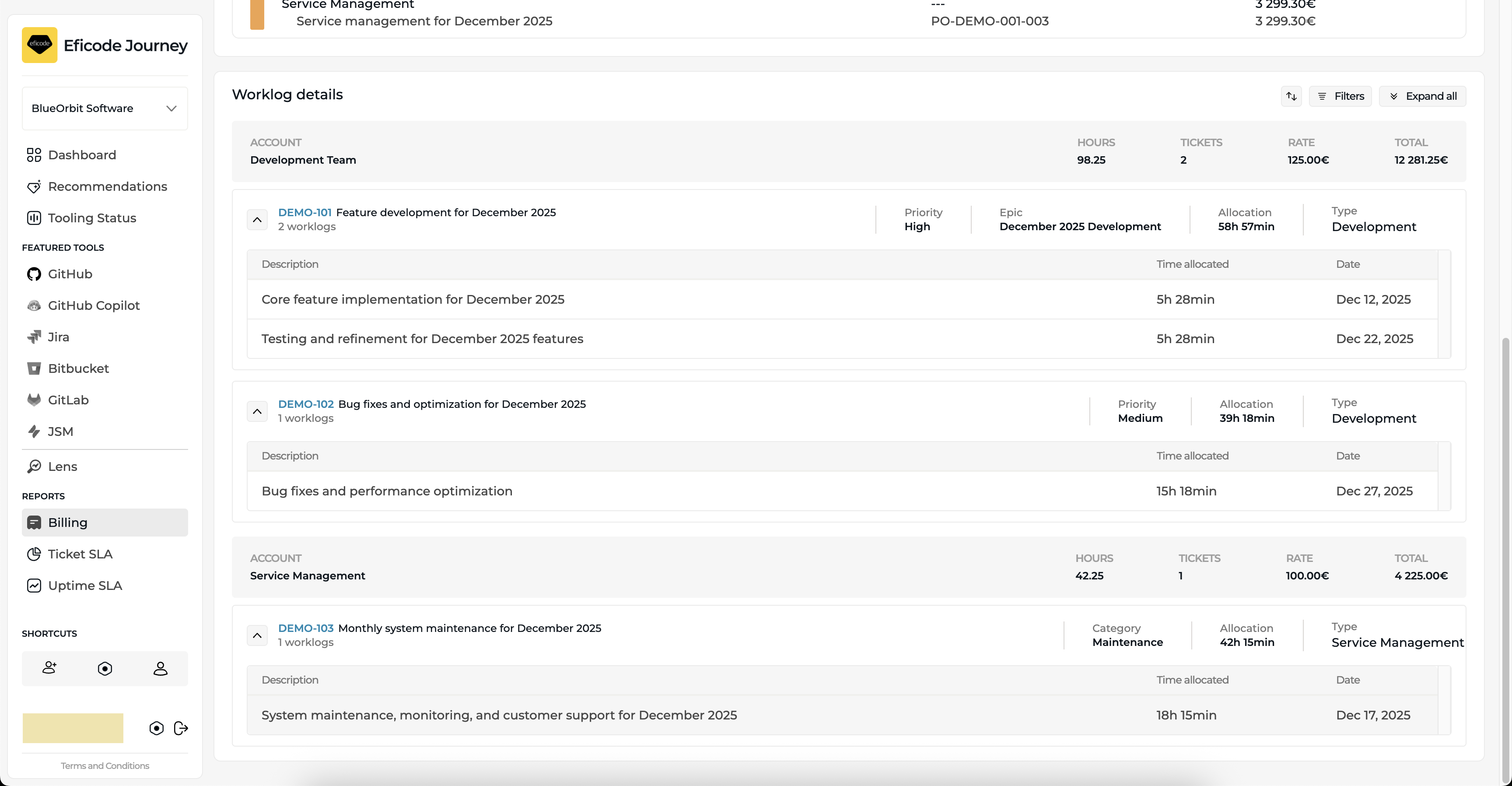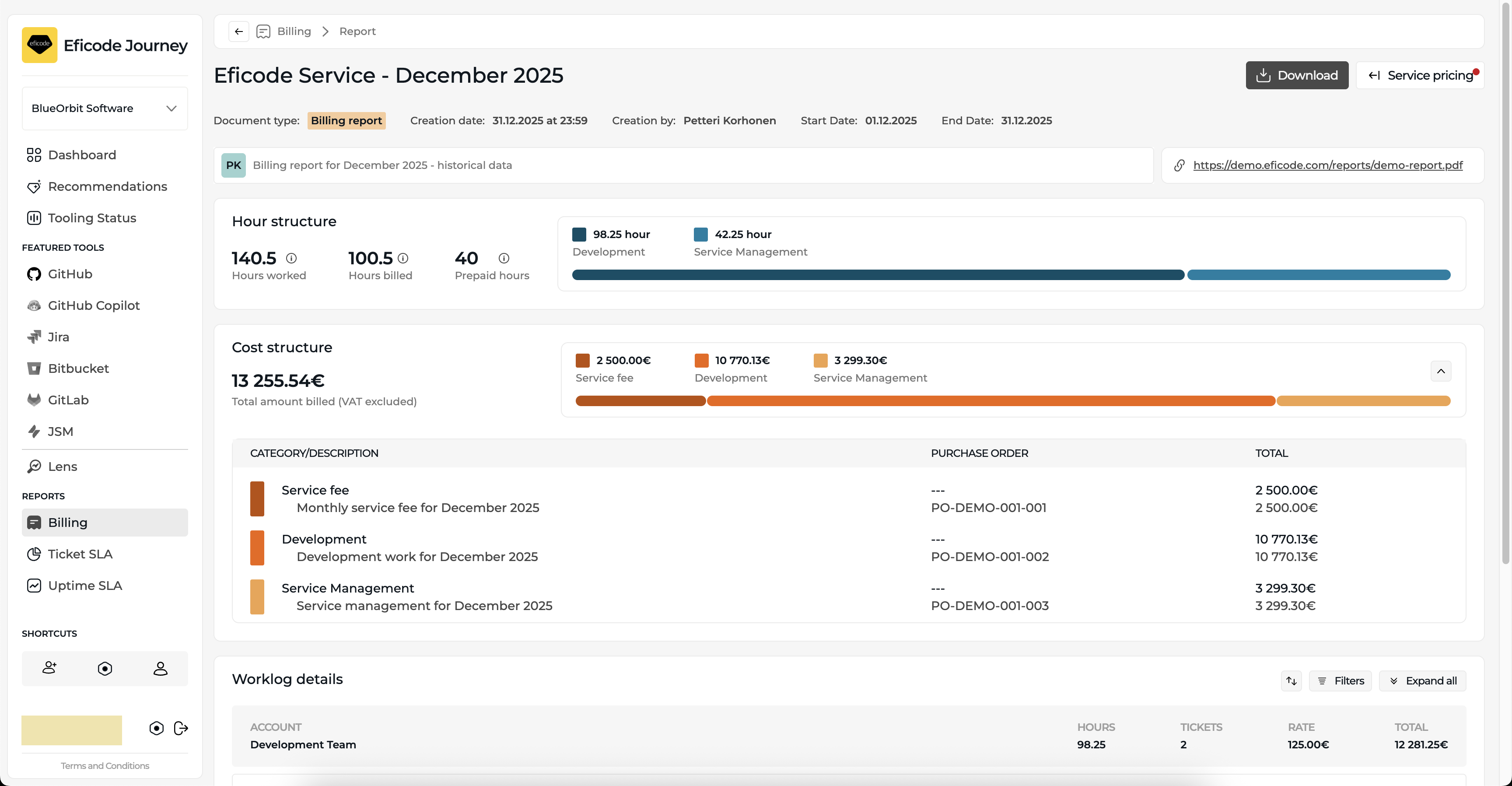 - Eficode business value: First feature that really impacted the Monthly Active Users (MAU), a requirement to add more features. Drove the adoption of Journey widely across Eficode Managed Services customers. Service Managers’ stress levels dropped significantly during the billing period thanks to this feature. They also could finally cover for each other. Significantly reduced human errors thanks to automation leading to higher customer trust.