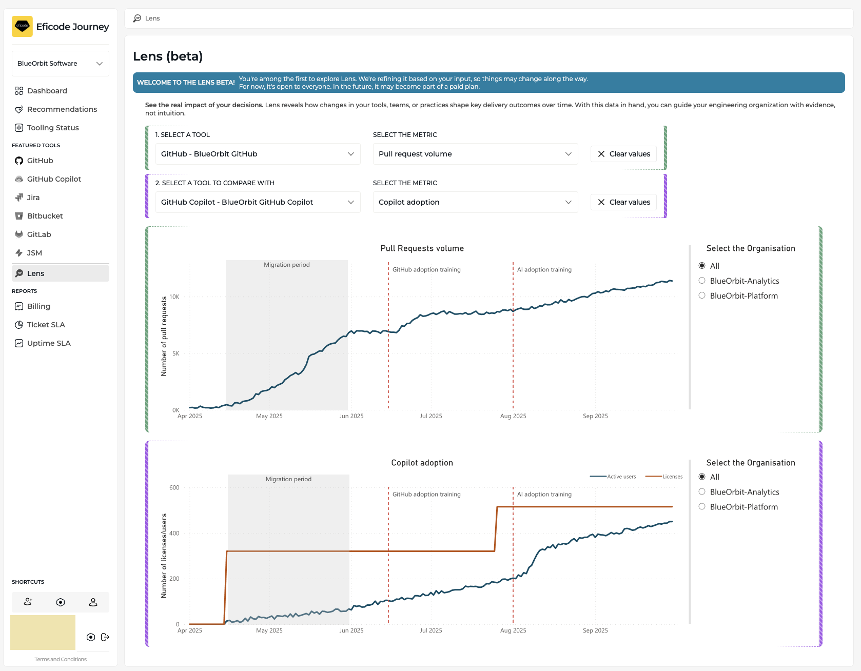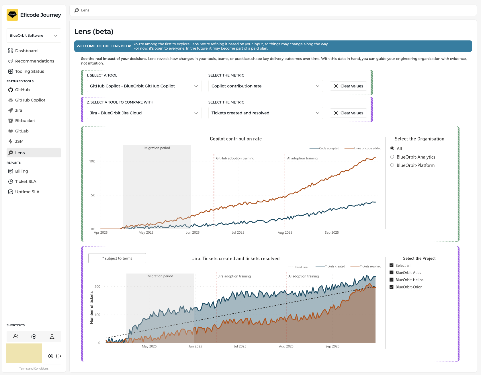 - What we shipped: This is probably the feature I’m most proud of. With the core product trio (PM, design, and engineering), we realized that by defining the x-axis as a specific unit of time, we could have multiple graphs displayed at the same time, regardless of the tool or the metric on the y-axis. This enabled us to build Lens, where one can, for example, see the impact of GitHub Copilot adoption in software teams on the amount of Jira epics closed (so more value reaches end customers, in an ideal case), and moments later look at how many security issues / UX issues it introduced, visible through GitHub security findings or Atlassian Service Desk bugs.