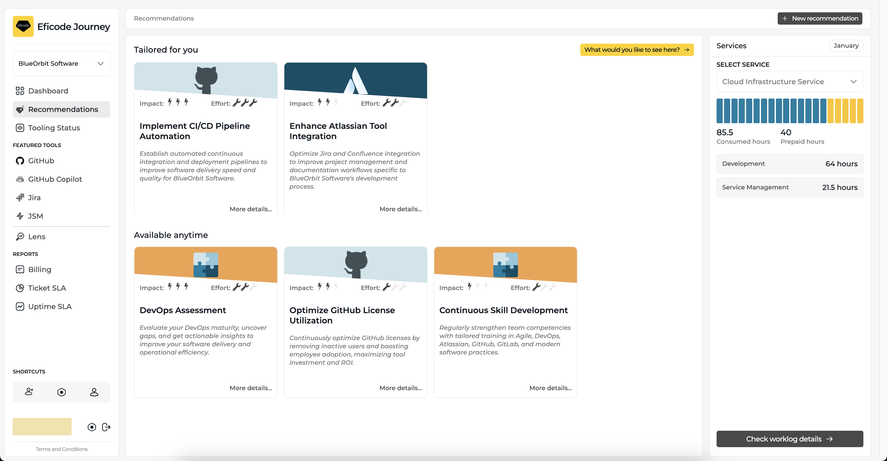 - Eficode business value: This feature hasn’t seen strong adoption yet, but it is starting to pick up with more and more Eficode Advisory and Support being sold. The problem stated above is not yet solved with this. In the instances where the customers got the recommendations through the feature, they usually continued the discussion with their main point of contact at Eficode.