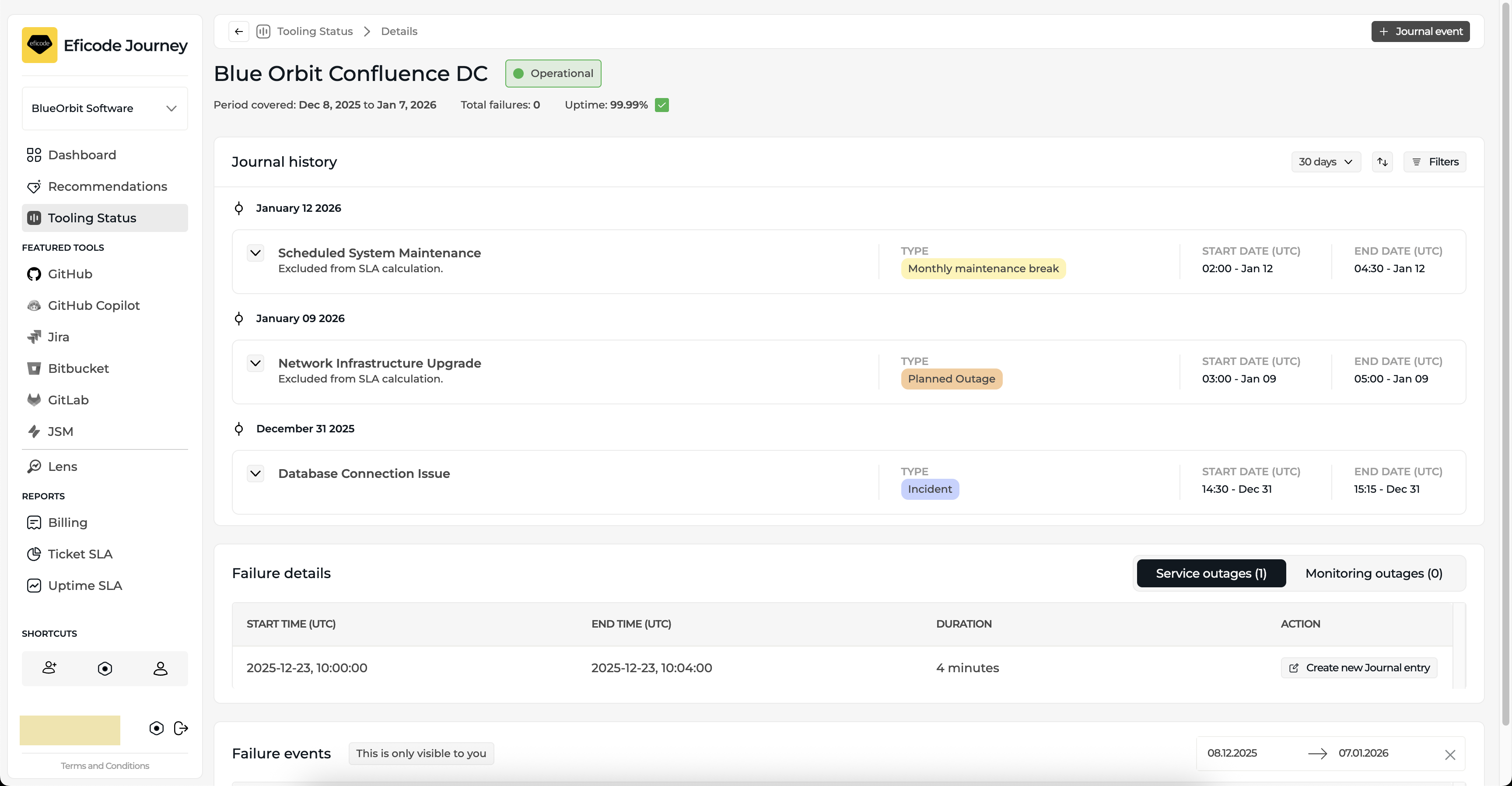 - What we shipped: Built on the same tool as the uptime SLA, there is now a live Status page showing whether the tool is working from inside the customer’s network, based on our uptime monitoring system. We also added planned outages as a reminder when downtime is expected.