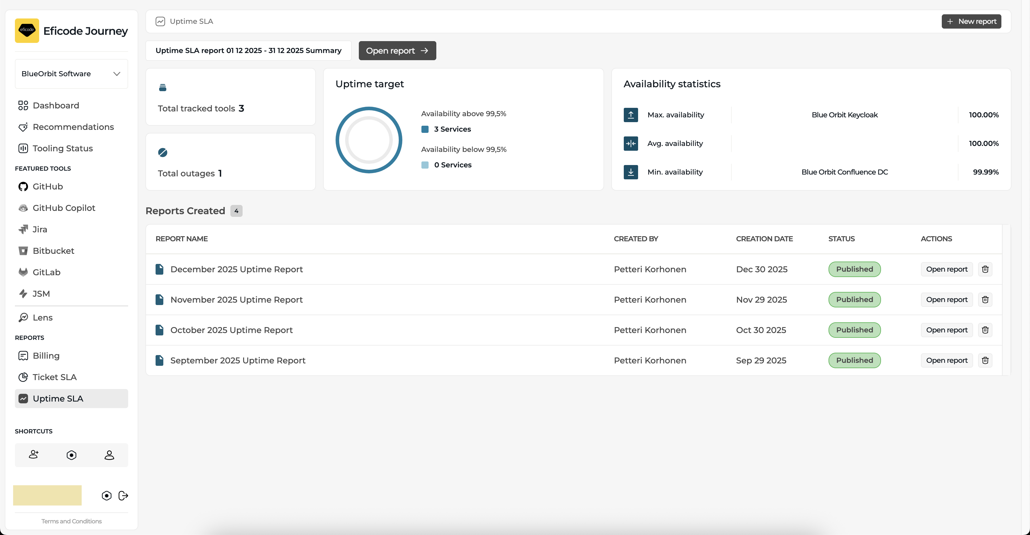 - Problem: The Uptime SLA (how well Eficode kept the customer’s tool available and working) was an incredibly time-consuming report to produce, and the data was unreliable in many cases. As a result, reports were usually not produced unless requested, even though they were included in the contract.
