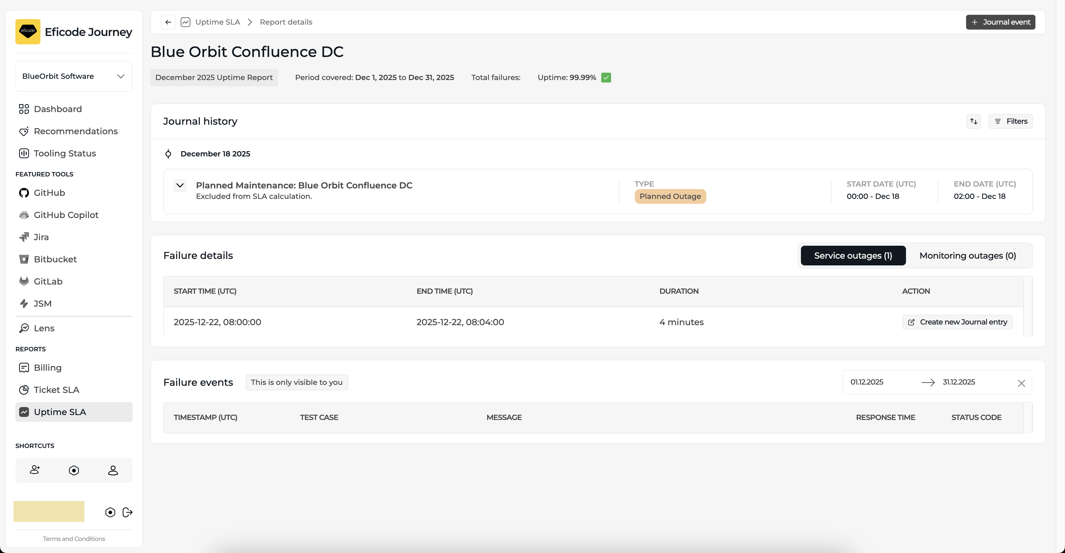 - What we shipped: Service Managers can now do the reports in two clicks and highlight issues and root causes for customers when relevant. The Monthly Maintenance Breaks and security patch updates are automatically removed from the uptime target percentage.