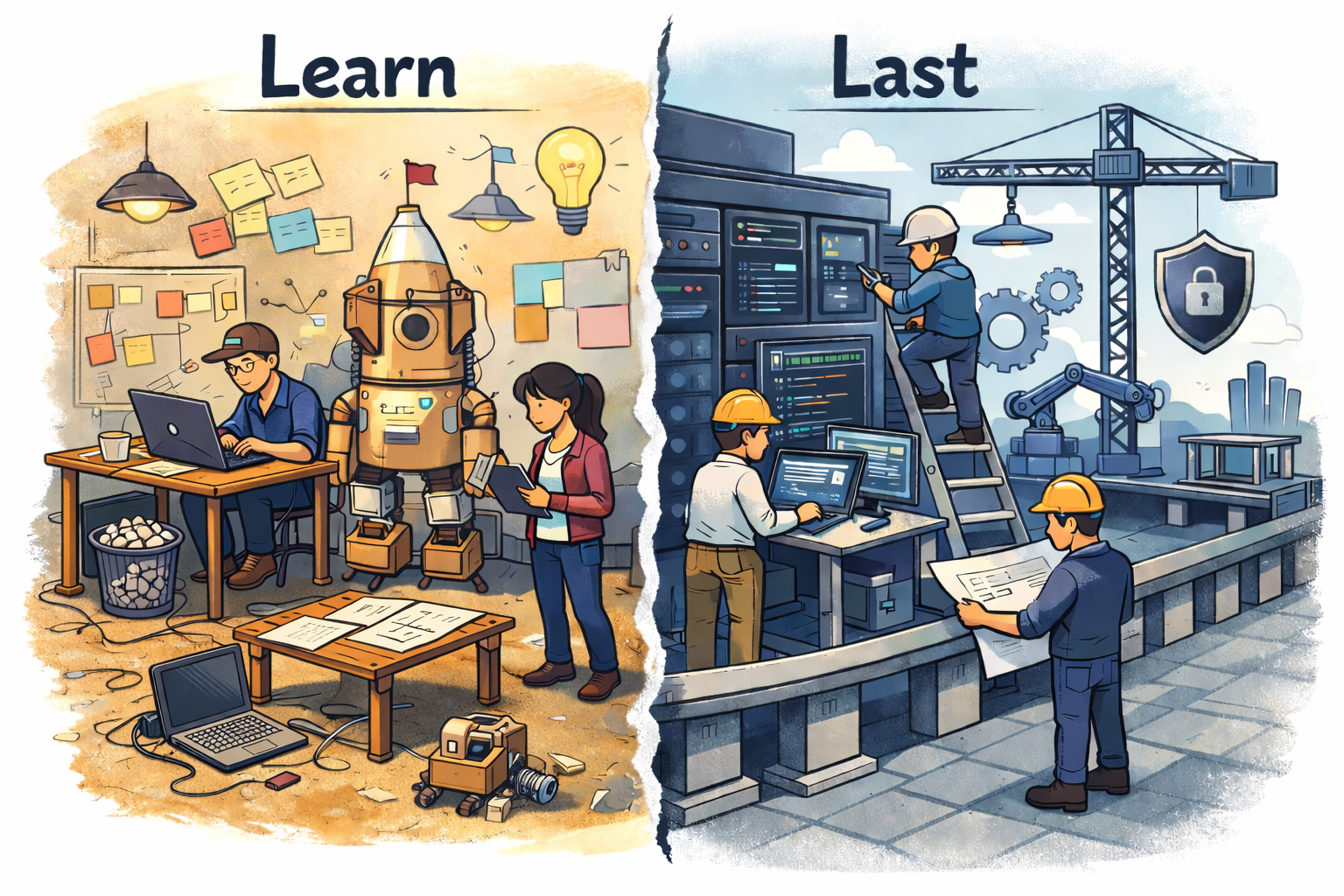 Software product teams build two very different kinds of work: artifacts to learn and systems to run. Confusing the two is one of the fastest ways to burn time, create friction with engineering, and ship the wrong product, late. This post proposes a simple lens: match your quality bar and process to intent, learning or longevity, to reduce waste, shorten time-to-value, and ship more reliable systems.